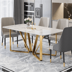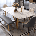 Dining Table: The table is crafted with a stainless steel frame, finished in a rich gold coating that gives it a gleaming, luxurious appearance. The tabletop can be made of tempered glass, Glossy Imported stone, complementing the golden frame and creating a seamless blend of modernity and elegance. The legs of the table are sleek and geometric, designed to support the table while maintaining a light, airy feel that allows the golden finish to stand out. The surface is spacious, ideal for accommodating multiple diners with ease.