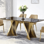 This luxurious dining setup features a striking Imported stone top table with a polished dark surface, beautifully complemented by a bold, golden sculptural base. The table base consists of two geometric, pleated pedestal legs with...