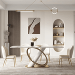 This contemporary dining set embodies minimalist elegance, featuring a striking rectangular table with a smooth white marble top. The standout feature is its unique base, a sculptural design combining a cylindrical pillar with intertwined gold rings, adding an artistic and luxurious touch to the space. The chairs, upholstered in soft cream fabric, have sleek, gold-tipped legs, exuding modern sophistication. Their quilted back design adds texture and comfort, blending form with function. The set is beautifully accentuated by the surrounding art and clean, neutral-toned decor, creating a serene and stylish dining atmosphere.