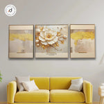 A stunning 3-piece leather painting set (2×2.5 ft + 2.5×2.5 ft + 2×2.5 ft) featuring embossed 3D textures, golden accents, and a heavy aluminum frame; blending craftsmanship and elegance for modern interior.
