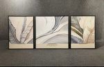 A 3-piece leather painting set (2×2.5 ft + 2.5×2.5 ft + 2×2.5 ft) featuring embossed leaf and abstract textures in neutral tones, framed in heavy aluminum — a serene balance of nature and modern design.