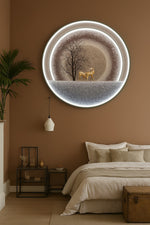 A premium 32×32 inch round crystal painting, featuring embossed diamond crystal textures of deer, tree, and snowy landscape. Enhanced with remote-operated LED lighting, it blends luxury art with modern ambiance.