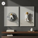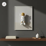 Handcrafted with precision, the artwork showcases a detailed lunar surface emerging from the frame, with a charming astronaut perched thoughtfully on its edge. The golden helmet contrasts beautifully against the muted grey moon and soft white frame, adding a touch of sophistication and cosmic allure.