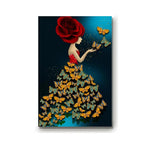 Transform your walls with this 2ft × 3ft (60×90 cm) handmade 3D textured canvas painting, where imagination meets artistry. The composition portrays a graceful lady with a blooming red rose as her head, her flowing gown crafted from a cascade of golden butterflies that seem ready to take flight.