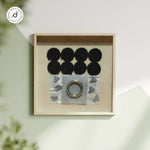 This pair of 40×40 cm glass shadowboxes celebrates geometry and texture in two contrasting forms. The first design layers rolled black circles, paper textures, and a central metallic ring, creating a striking monochrome abstract composition....