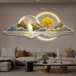 Bring harmony and grandeur to your walls with the Golden Horizon Acrylic Crystal Painting (48×24 in / 4×2 ft). This statement artwork showcases a serene mountain landscape under a radiant moon, with a glowing golden tree and deer, symbolizing prosperity, strength, and balance with nature.