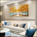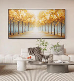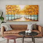 This handmade textured canvas painting (70×100 cm) brings the serene charm of autumn indoors. The artwork features rows of tall golden trees, their foliage glowing in warm amber tones, leading into a bright, misty horizon. The composition creates an illusion of depth and perspective, inviting the viewer to step into the tranquil scene.