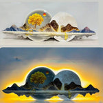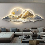 Operated via remote control, the LED backlight offers convenience and ambient warmth, making this artwork both a decorative centerpiece and a functional mood light. The imagery of mountains, moons, and water embodies tranquility, harmony, and prosperity, making it perfect for living rooms, lounges, or hallways.